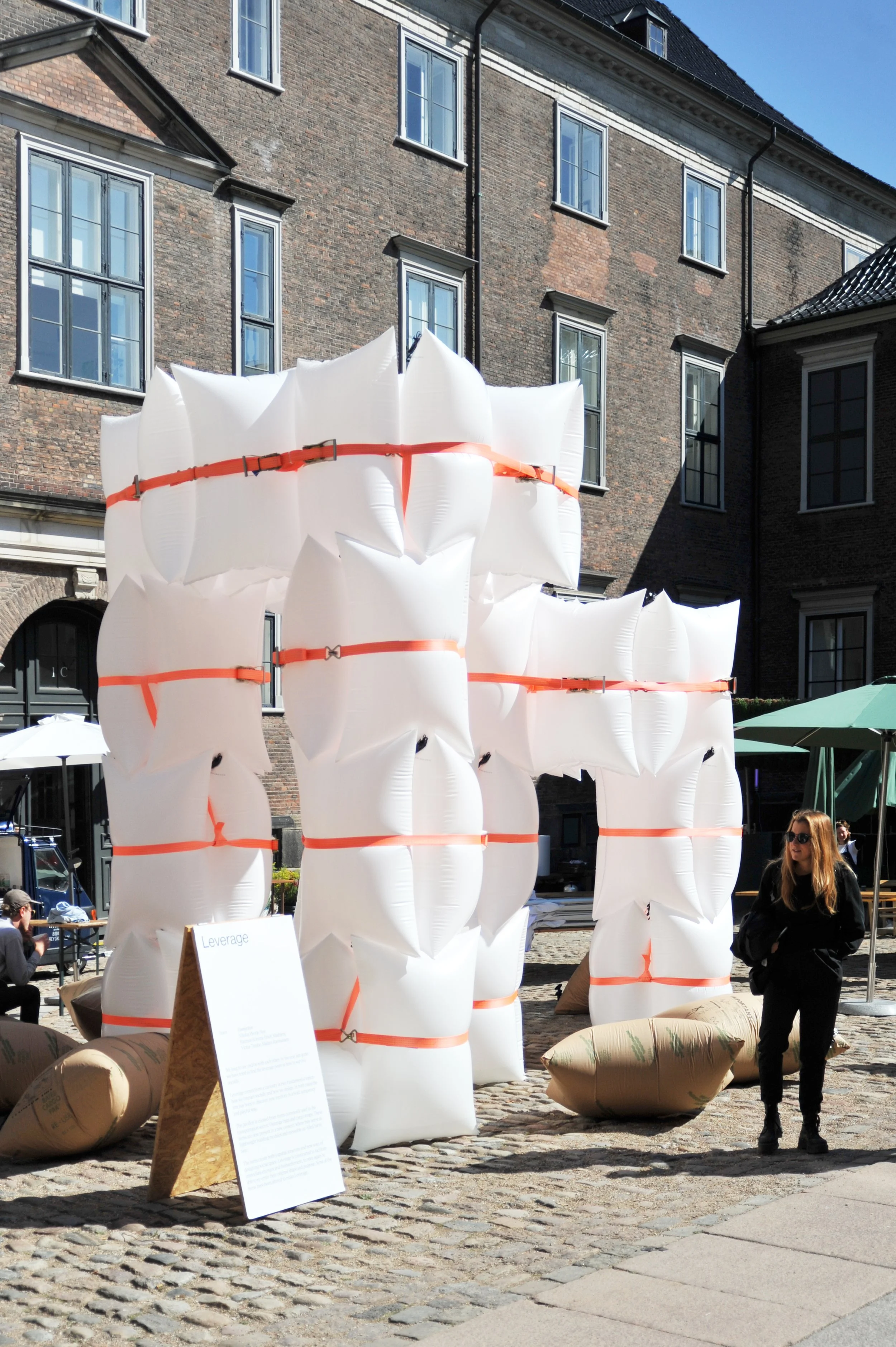 The project explored social interaction and design through a playful, temporary pavilion. Using dunnagebags and cargo straps from the transport sector, the installation reimagined these elements as lightweight building modules and inflatable furniture.